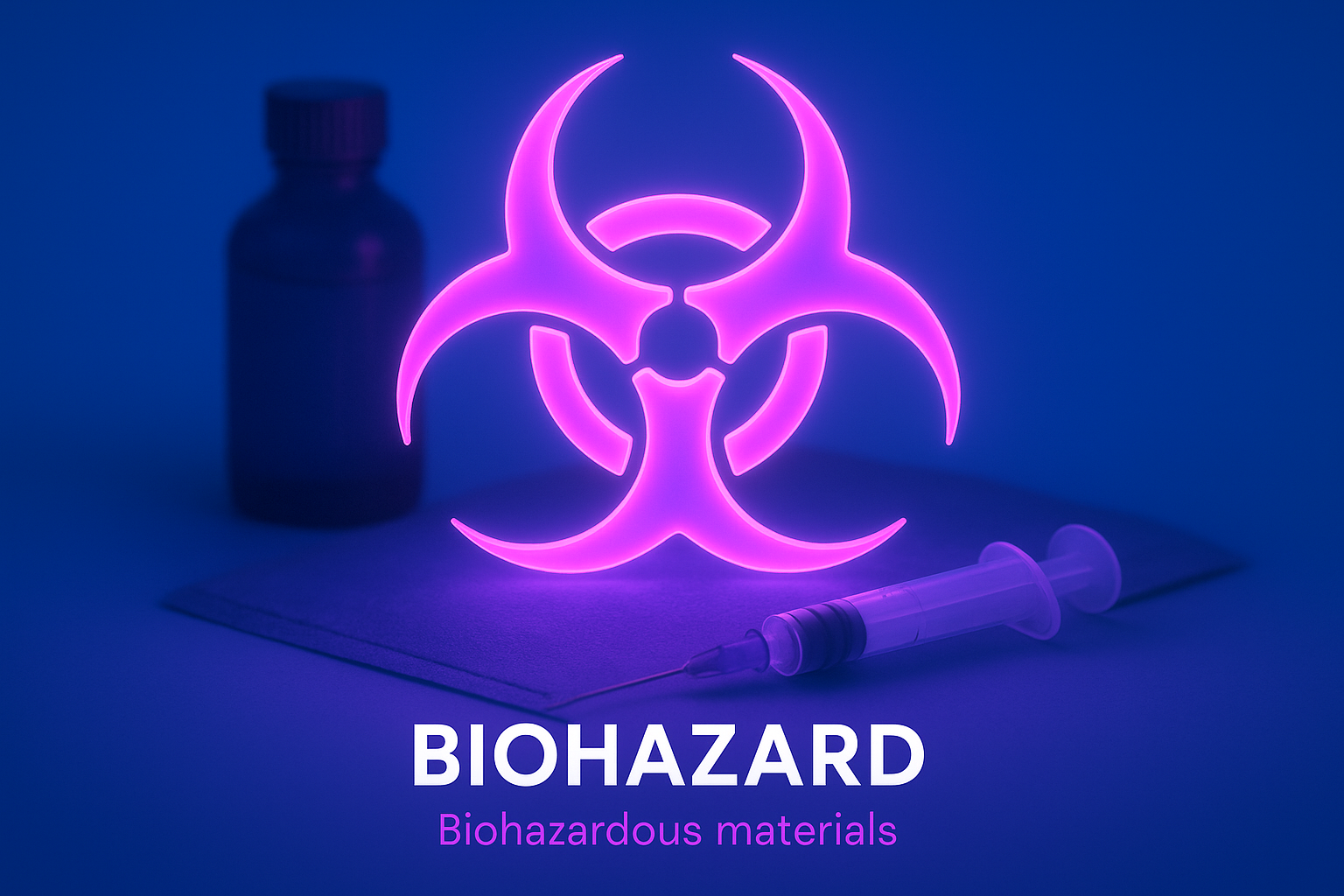 /Collection: /by davooda/Type: PNG/A glowing biohazard symbol radiates neon pink light against a solid blue background. Adjacent to a syringe and vial, it creates a striking contrast, emphasizing the theme of biohazardous materials.