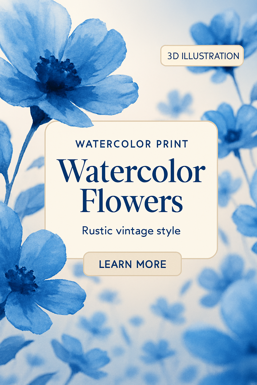 This image features a watercolor print of blue flowers in a rustic vintage style, suitable for promotional materials or art displays.