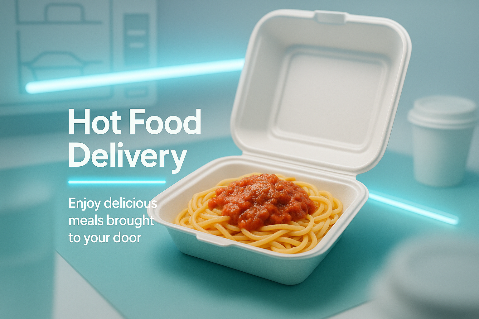 /Collection: /by davooda/Type: PNG/A visually appealing food delivery graphic featuring a takeout container with spaghetti and sauce, designed for marketing food delivery services. The modern aesthetic and vibrant colors attract attention.
