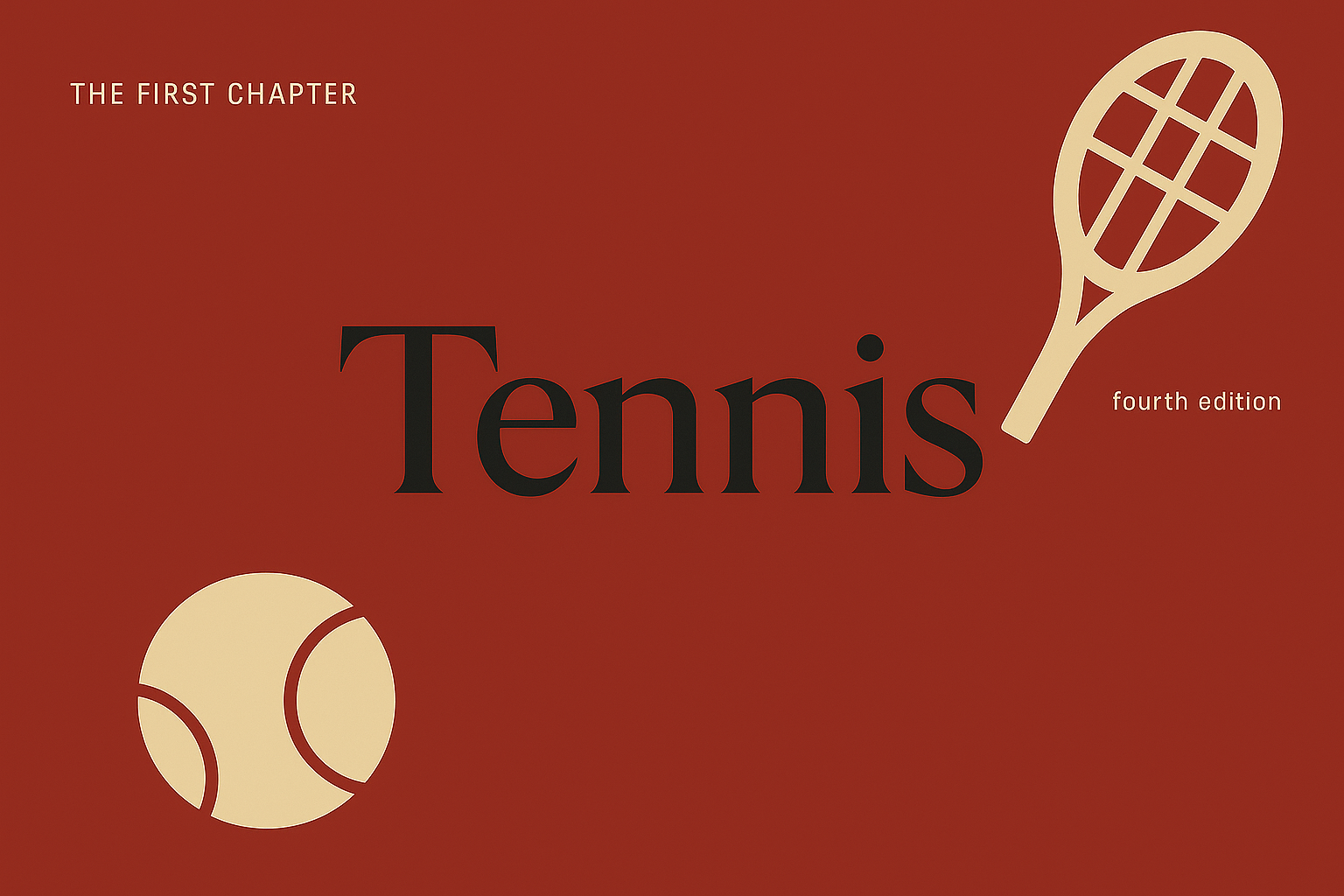 /Collection: /by davooda/Type: PNG/A creatively designed book cover for a tennis-themed publication. It features a rich red background, bold typography for the title, and minimalist illustrations of a tennis racket and ball.