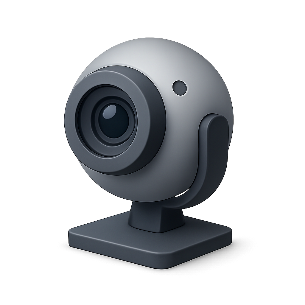 A sleek, 3D-rendered webcam icon presented in a three-quarter view. The design features a glossy lens and a stable base, showcasing a modern aesthetic.