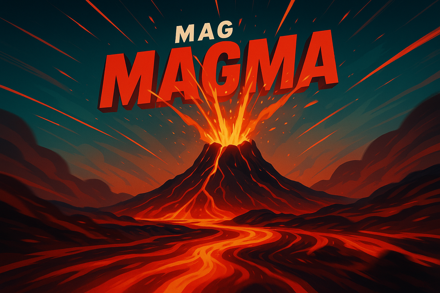 A vibrant depiction of a magma eruption, showcasing dynamic lines radiating from a volcano. The scene features rich colors with a smooth gradient background, emphasizing motion and energy.