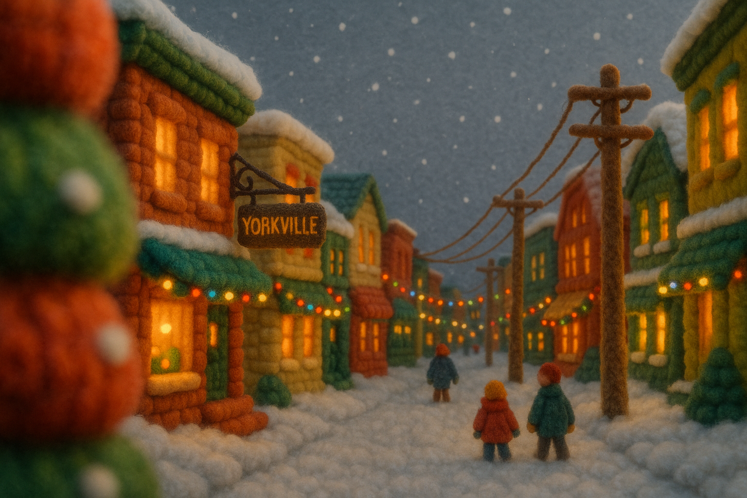 A cozy winter scene depicting Yorkville, Toronto, crafted from wool-like textures. The layered depth shows a snowy street with small figures, festive lights, and a warm atmosphere.