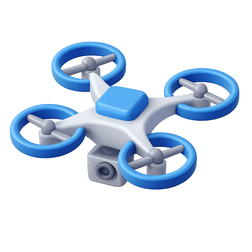 A visually appealing 3D icon of a drone featuring a transparent background. The drone is depicted in a three-quarter view with an isometric, volumetric design, highlighted by blue accents.