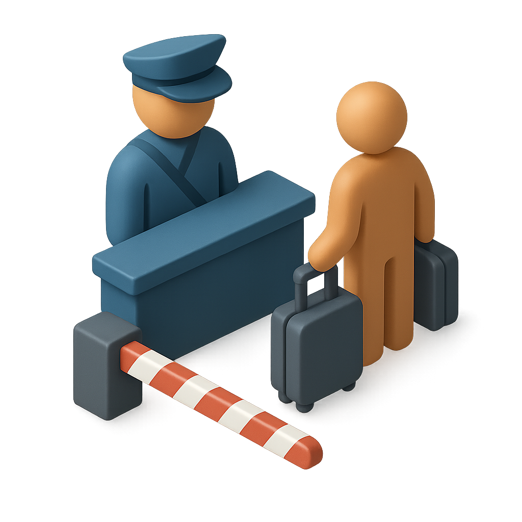 A 3D icon depicting a border control scene, featuring a customs officer at a desk and a traveler with suitcases. The design emphasizes isometric and volumetric elements for a modern look.