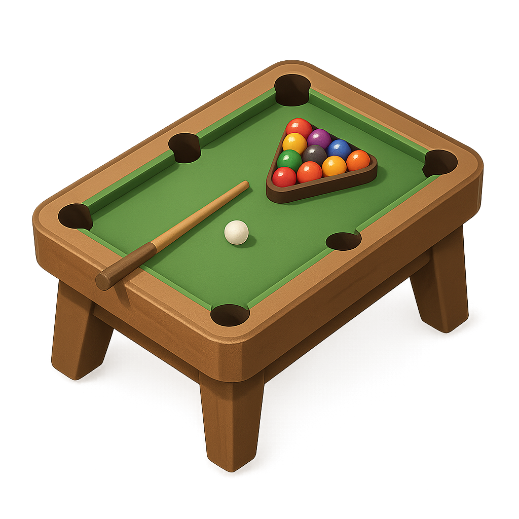 A visually appealing 3D icon of a billiard table featuring a triangle of colorful pool balls and a cue stick. The table is presented in a three-quarter view with a smooth, isometric design.