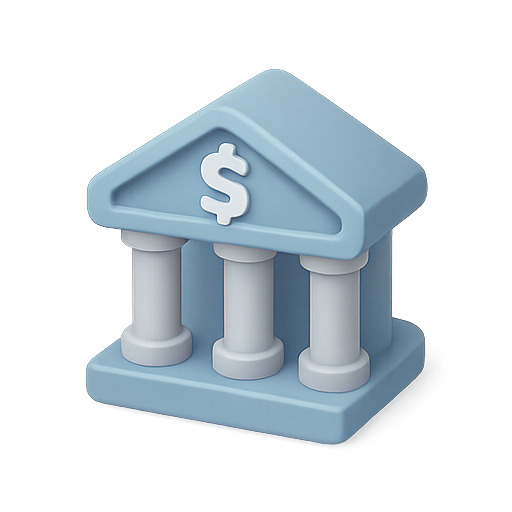 A stylized 3D representation of a bank building, featuring a dollar sign and three pillars, ideal for financial applications, websites, or mobile apps.