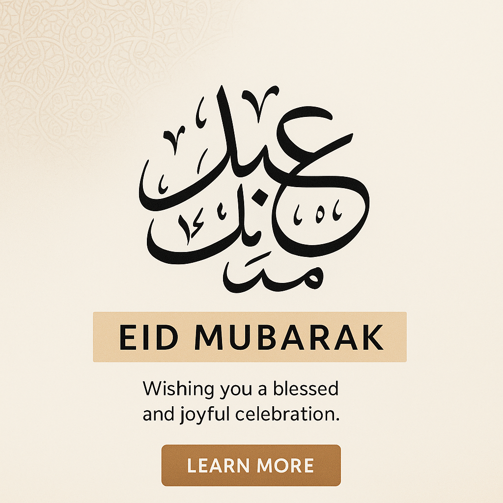 /Collection: /by davooda/Type: PNG/A beautifully designed Eid Mubarak greeting featuring elegant Arabic calligraphy against a light background with intricate Islamic patterns. The design includes a call-to-action button.