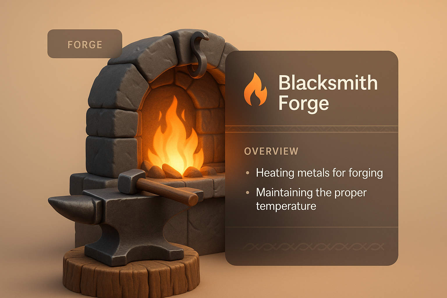 A detailed 3D illustration of a blacksmith forge featuring glowing coals, integrating two informative blocks with text and icons. The design is bright and cohesive.