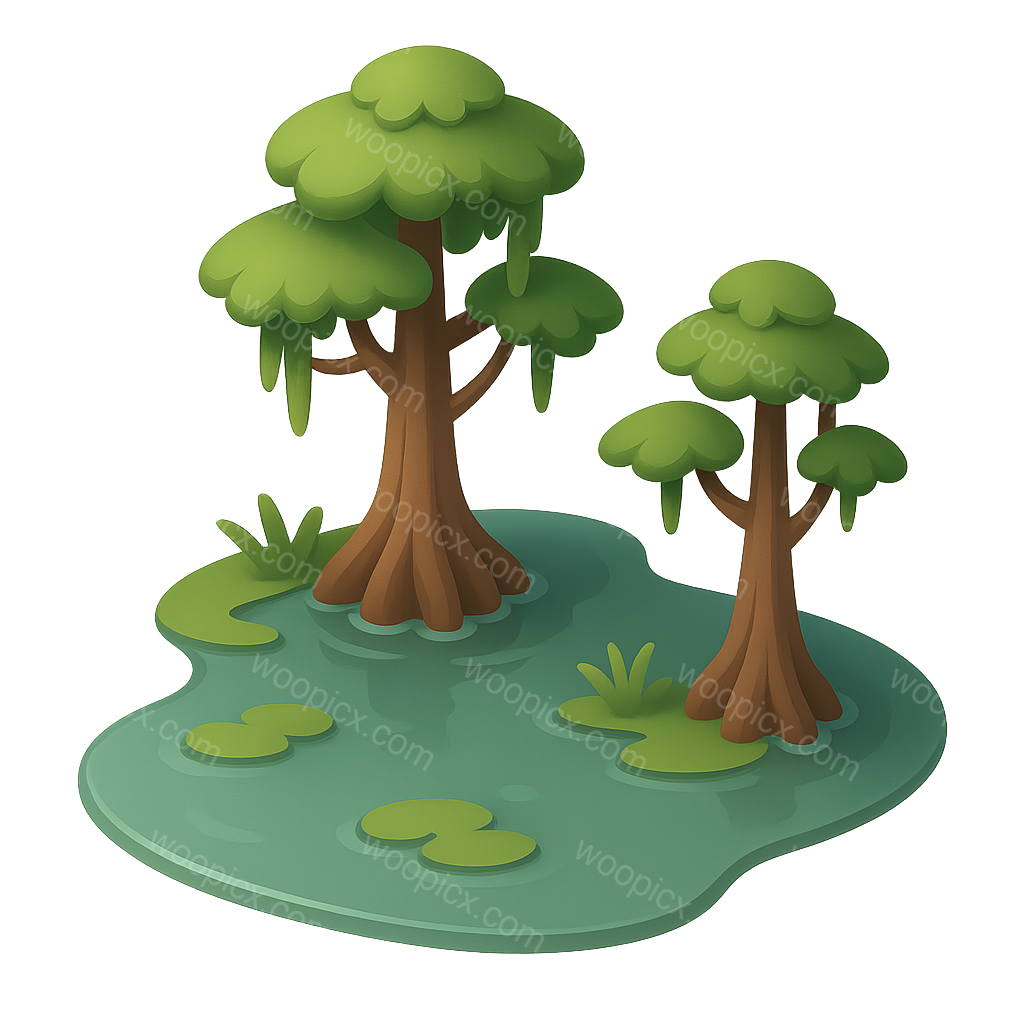 A stylized 3D icon depicting cypress trees in a swamp setting, featuring a small pool of water and lush greenery. The design has a vibrant color palette and a volumetric feel.