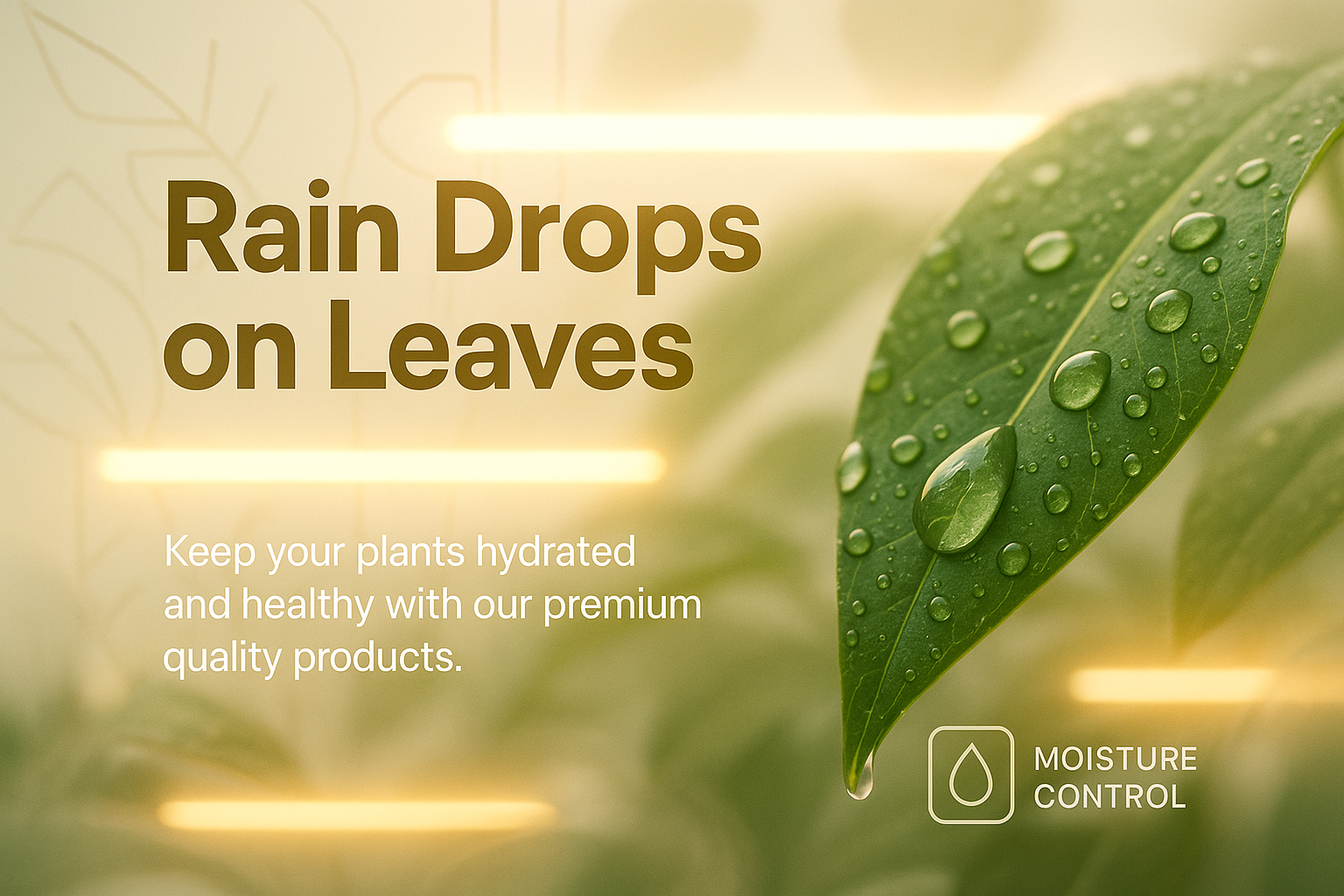/Collection: /by davooda/Type: PNG/A visually appealing close-up image showcasing raindrops on lush green leaves, designed for a promotional context emphasizing plant care. Ideal for marketing moisture control products.
