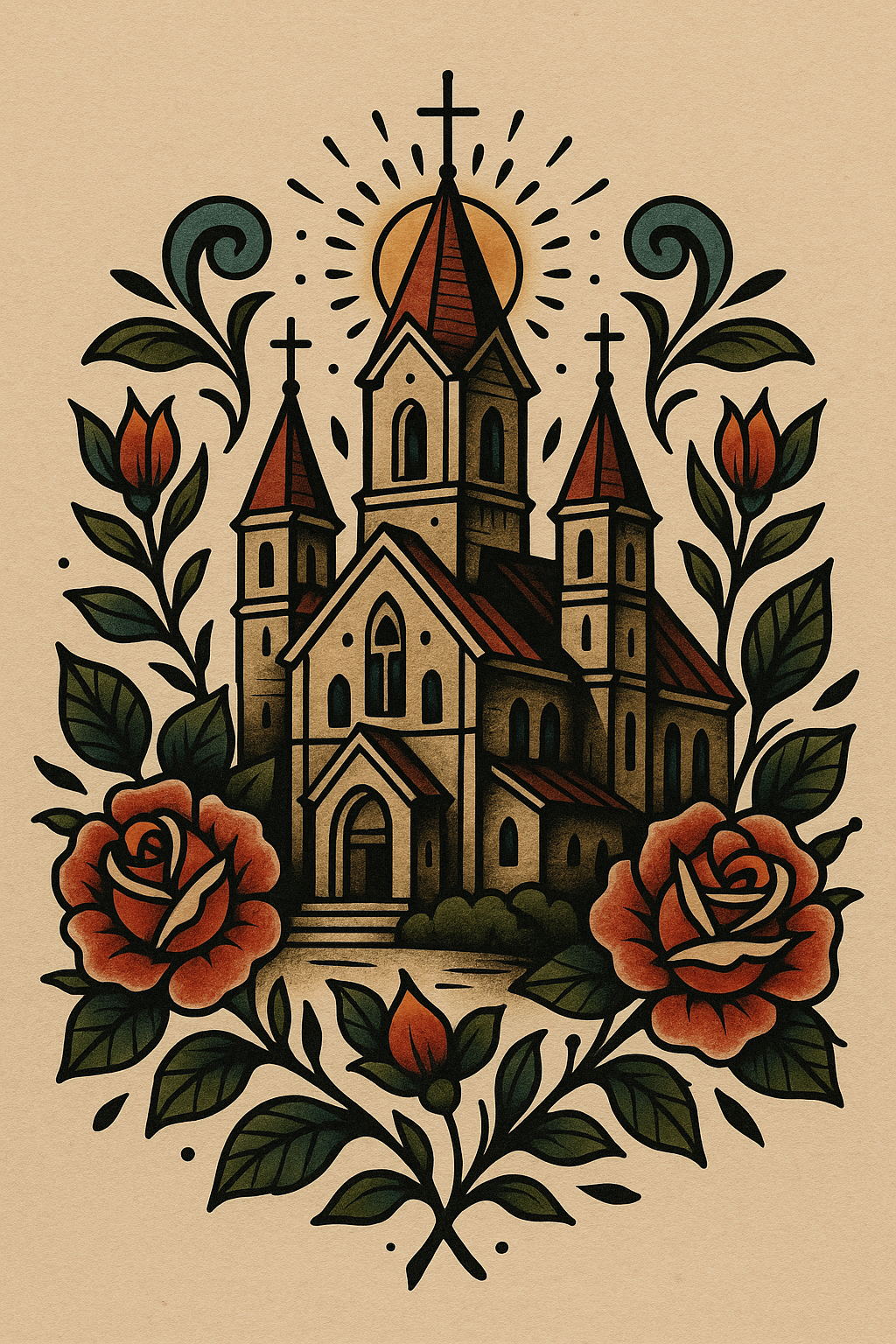 This graphic features a stylized illustration of a church surrounded by decorative roses and foliage, ideal for art prints or tattoos.