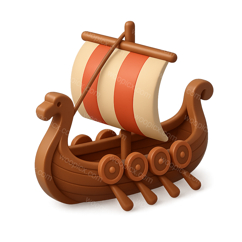 A stylized 3D icon of a Viking longship featuring a brown hull, a striped sail, and oars. The design has a transparent background and a three-quarter isometric perspective.