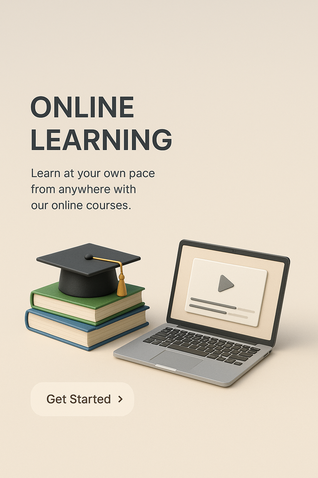 /Collection: /by davooda/Type: PNG/A visually appealing 3D render showcasing online learning. Features a graduation cap on books, a laptop with a play button, and a call-to-action button. The scene emphasizes a spacious layout for text.