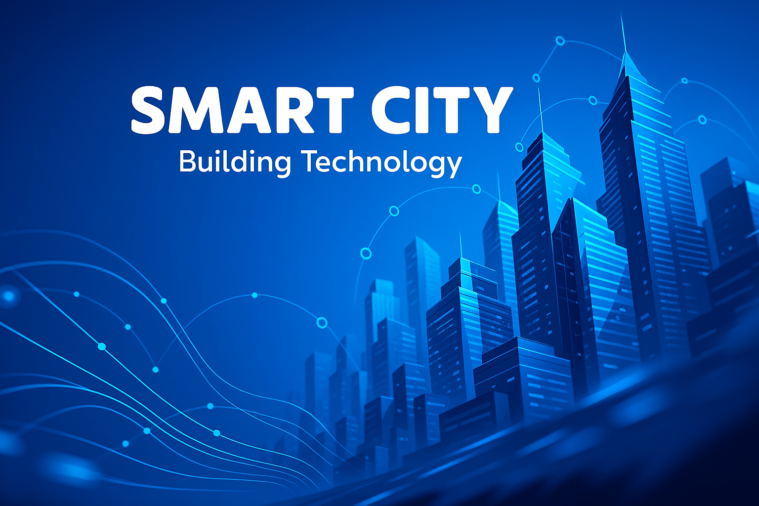 /Collection: /by davooda/Type: PNG/A vibrant digital illustration of a futuristic smart city skyline, showcasing advanced building technology and urban infrastructure in shades of blue, with dynamic visual elements.