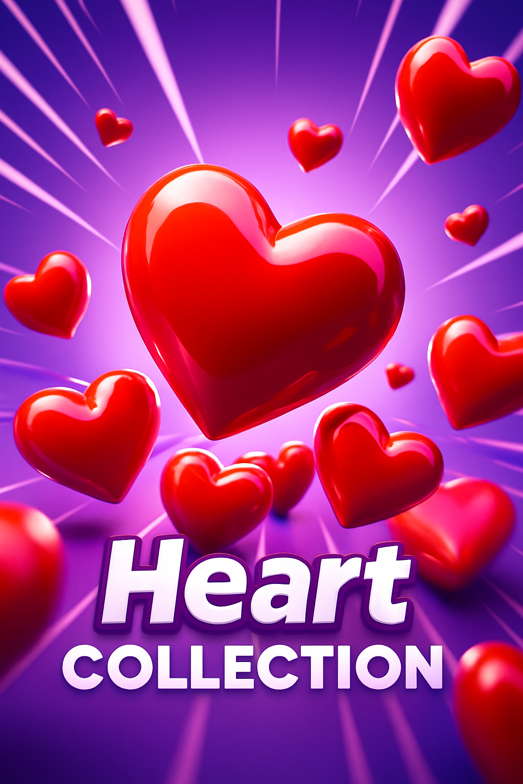 /Collection: /by davooda/Type: PNG/A visually striking collection of shiny 3D hearts in various sizes, radiating from a dynamic center against a smooth gradient background. The title 'Heart Collection' is prominently displayed in a bold, engaging font.
