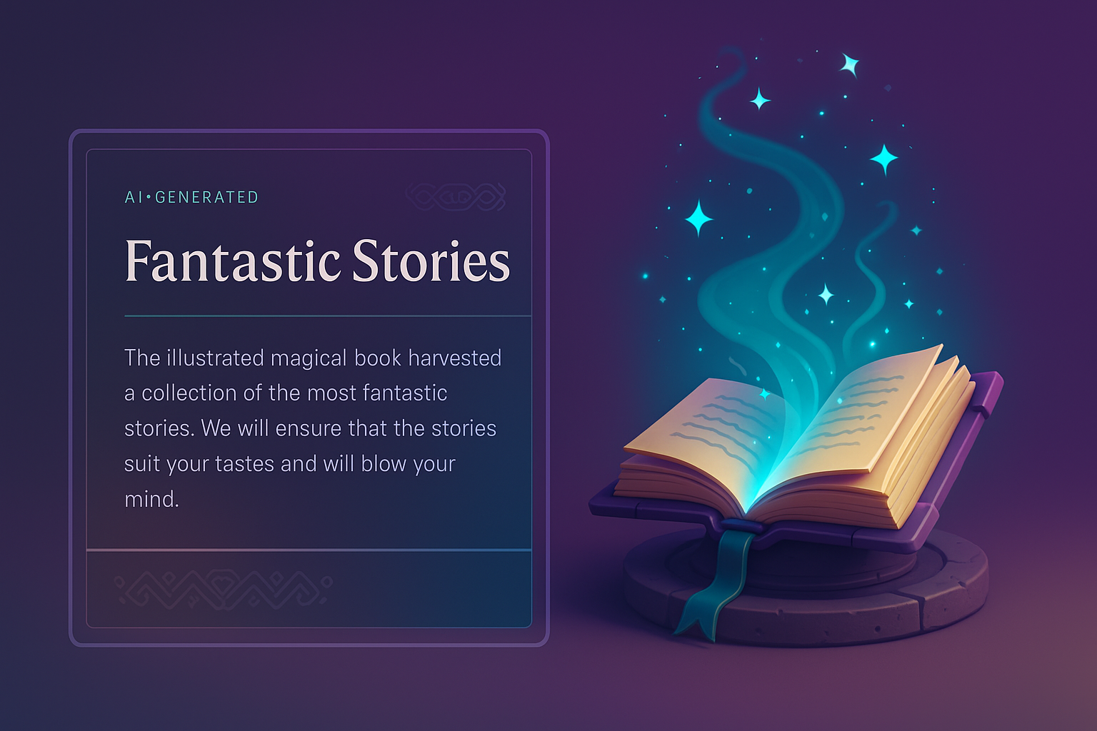 This illustration features a magical book emanating glowing wisps of creativity, showcasing a collection of fantastic stories. The design integrates a smooth gradient background for an enchanting effect.