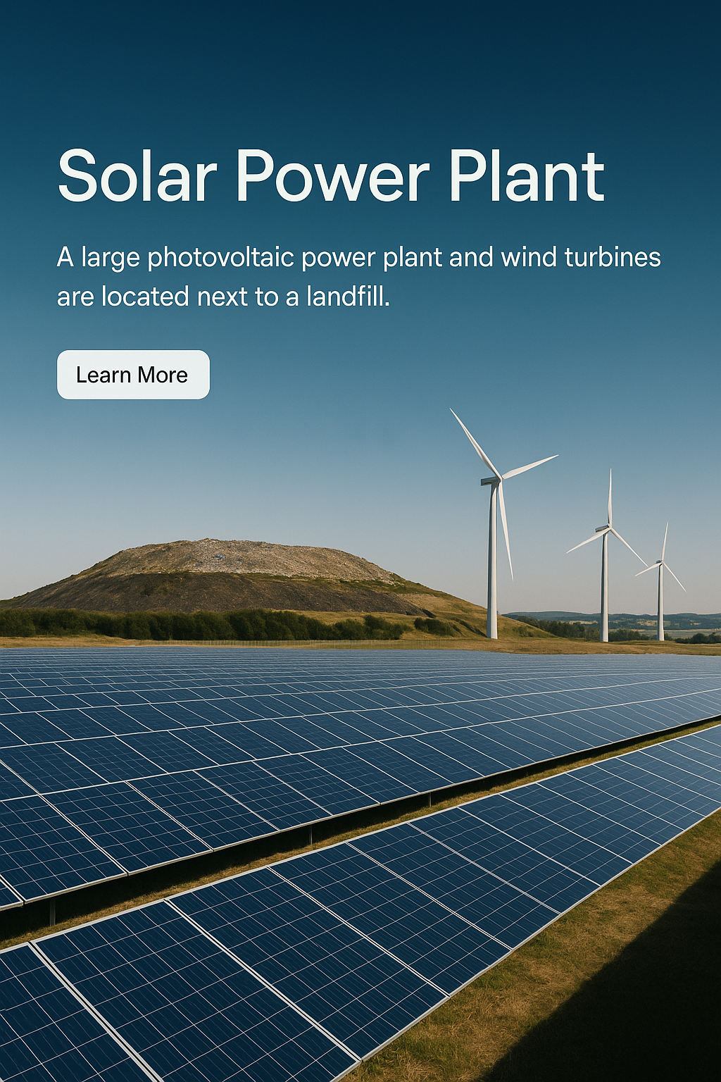 /Collection: /by davooda/Type: PNG/A panoramic view showcasing a large photovoltaic power plant with solar panels in the foreground and wind turbines in the background, situated next to a landfill.