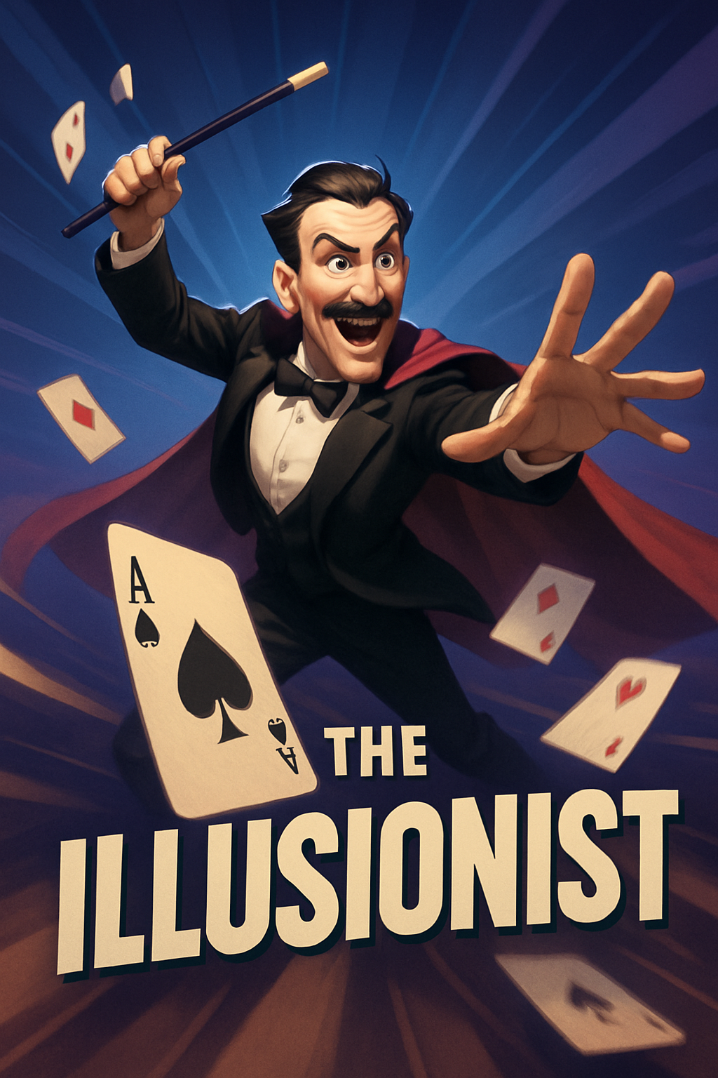 A charismatic illusionist in a tuxedo dramatically performs magic tricks, with playing cards flying around him. The scene is vibrant and energetic, emphasizing the illusionist's dynamic pose.