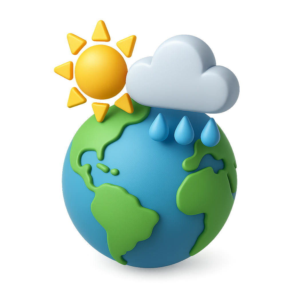 A vibrant 3D icon depicting Earth with a sun and cloud. The sun shines brightly while the cloud releases raindrops, symbolizing climate elements. The design is isometric and volumetric.