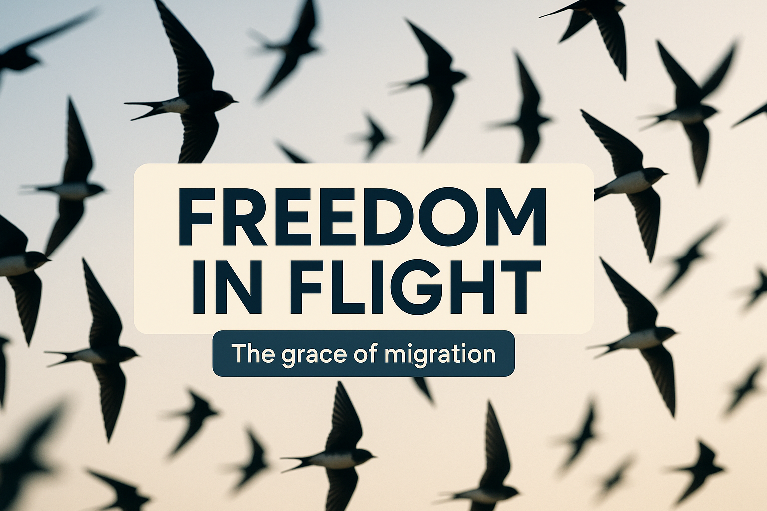 /Collection: /by davooda/Type: PNG/A visually striking graphic featuring a flock of birds in flight, representing themes of freedom and migration. The design uses soft colors and bold typography, suitable for nature-themed campaigns or motivational content.