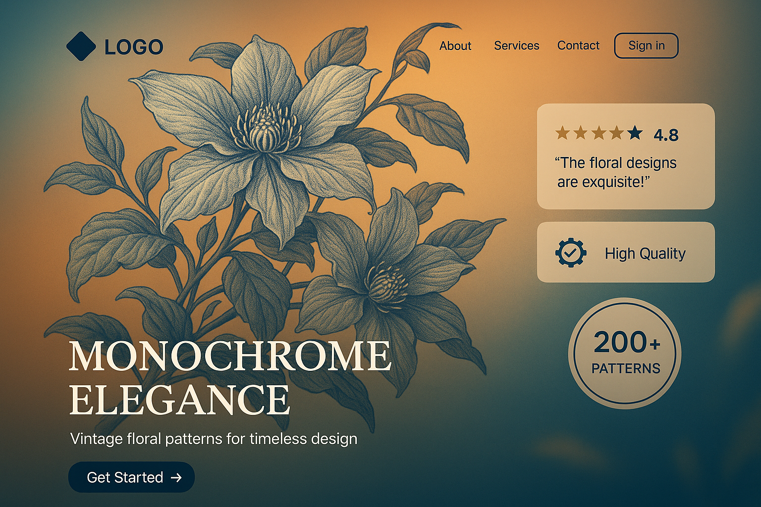 A visually dynamic landing page featuring vintage floral patterns with a modern twist. It includes a logo, action buttons, and customer ratings.