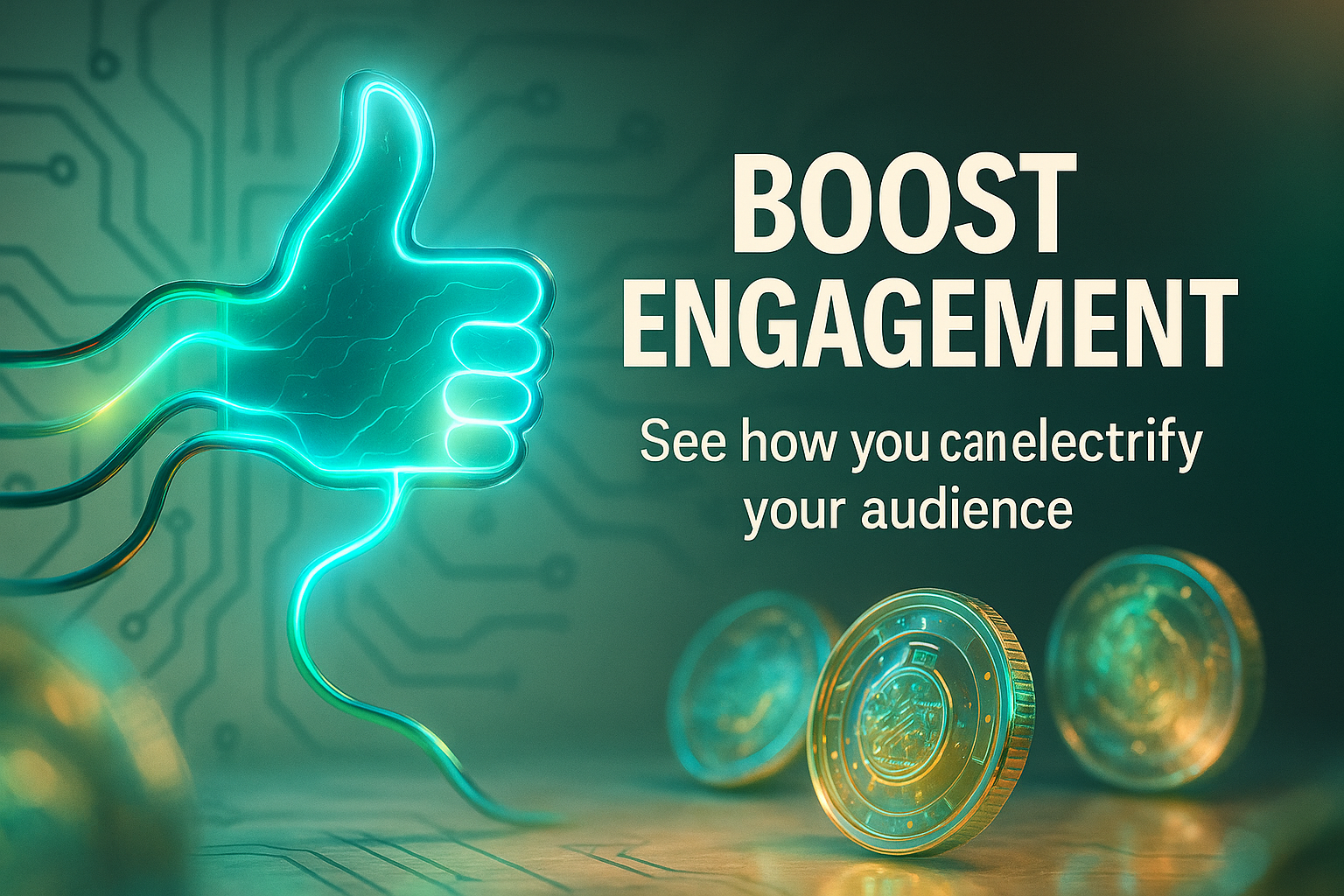 /Collection: /by davooda/Type: PNG/A visually striking digital marketing image featuring a glowing thumbs-up symbol and stylized coins, designed to attract attention for audience engagement strategies. Ideal for social media or promotional use.