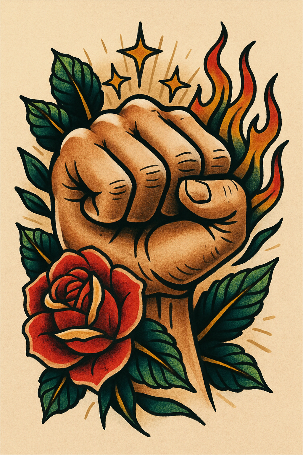 This graphic features a bold, stylized fist surrounded by a rose and flames, ideal for tattoos or empowerment themes. The vintage aesthetic appeals to those interested in tattoo culture.