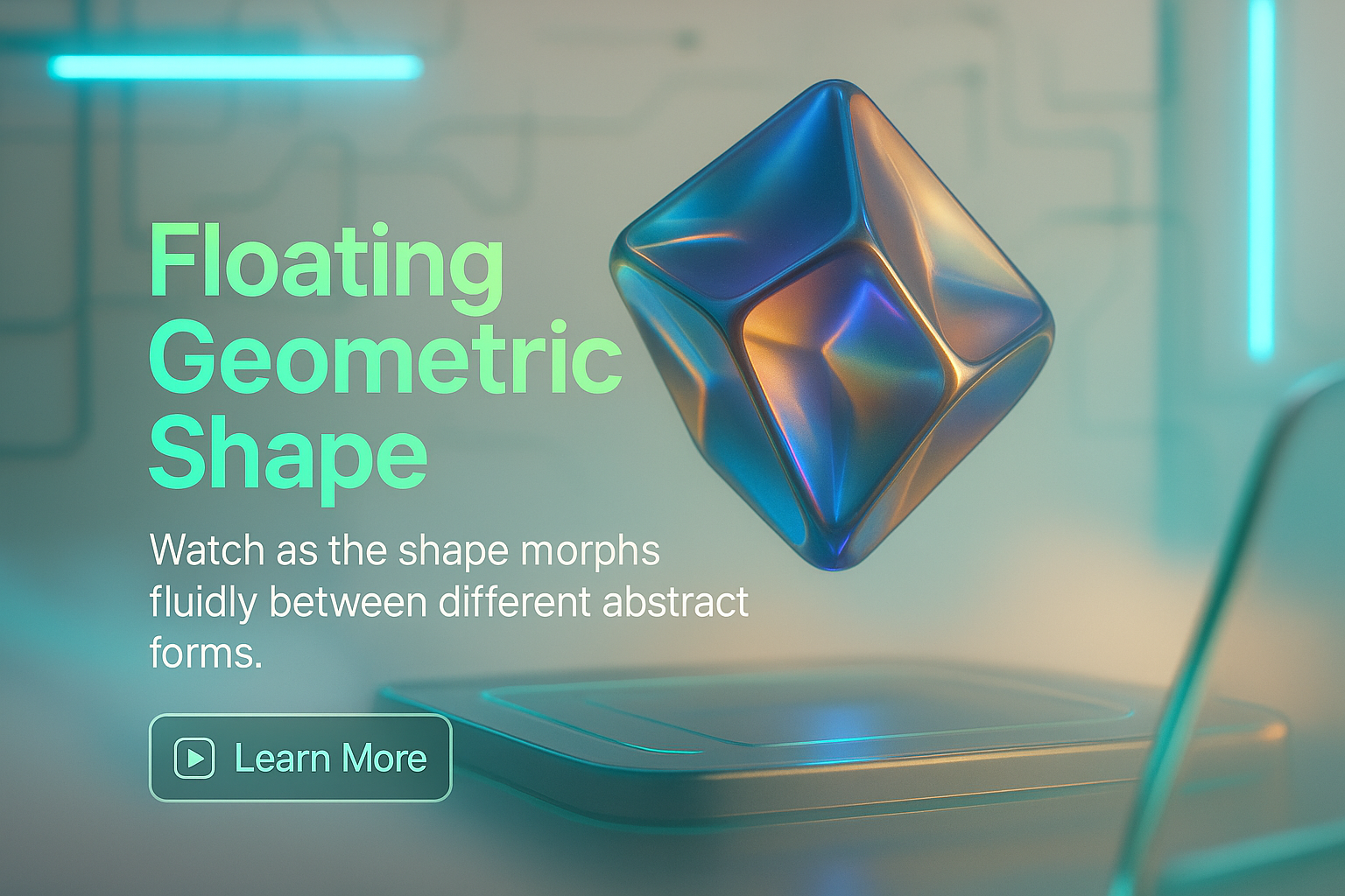 /Collection: /by davooda/Type: PNG/A visually striking 3D rendering of a geometric shape that dynamically morphs, set against a softly illuminated background with neon accents, ideal for tech-related promotions or digital art showcases.