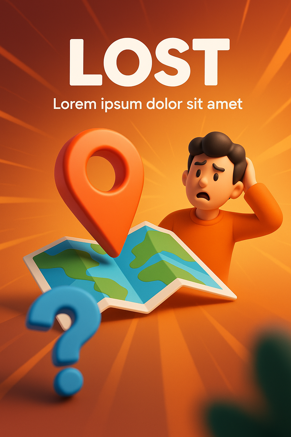 /Collection: /by davooda/Type: PNG/This image features a 3D illustration of a character looking confused with a map and location pin. It's suitable for themes of navigation and exploration.