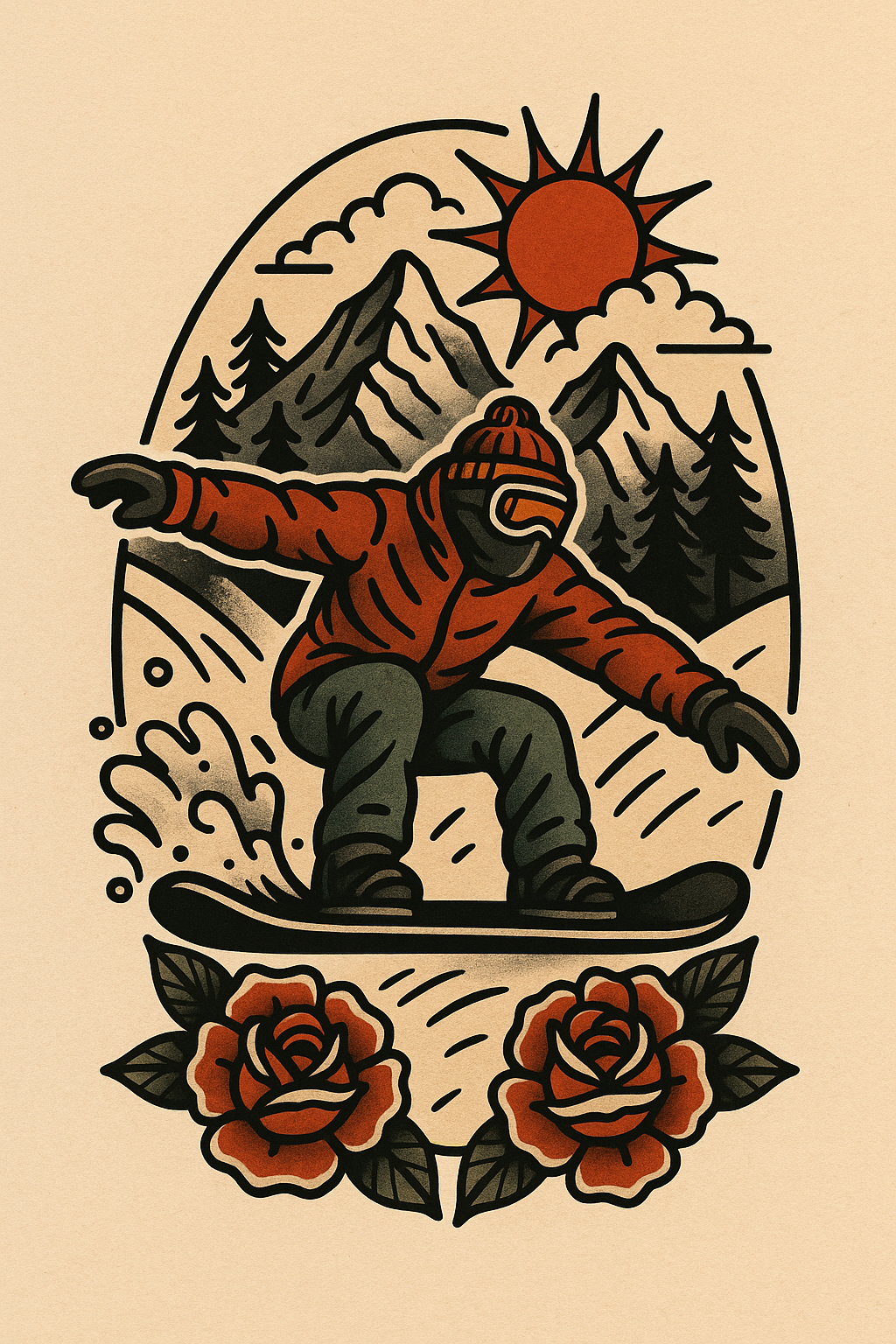 A vibrant illustration featuring a snowboarder in action, set against a backdrop of mountains and decorative roses, ideal for apparel or posters.