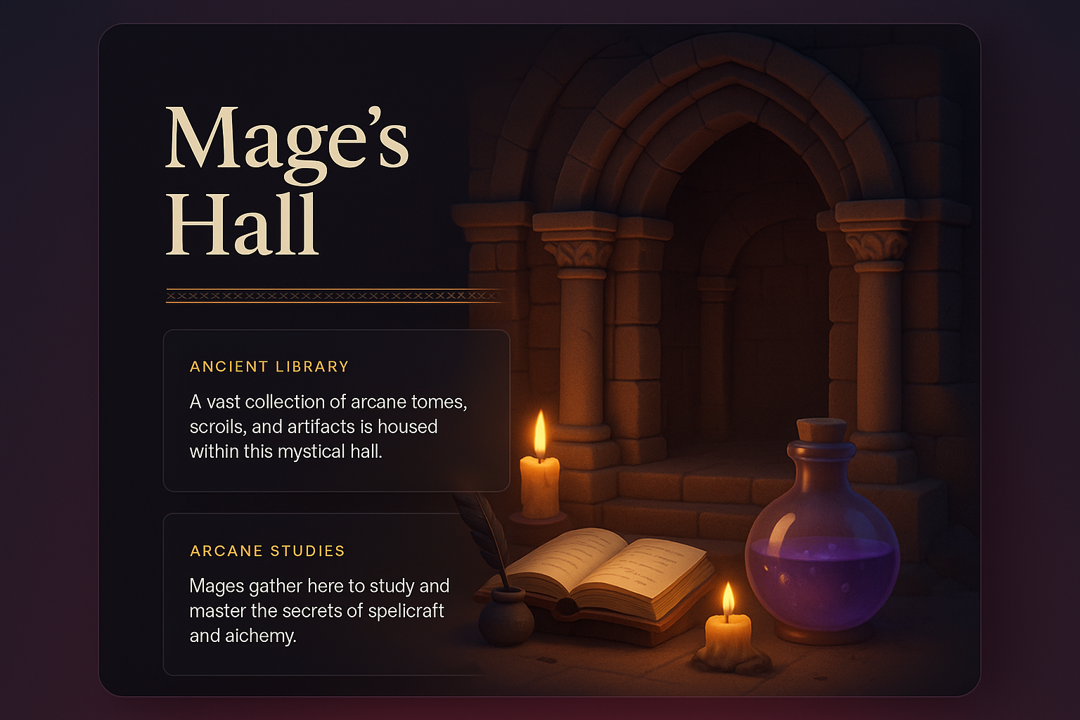 A beautifully designed image of a mystical hall featuring ancient tomes, scrolls, and potions, ideal for fantasy-themed projects.
