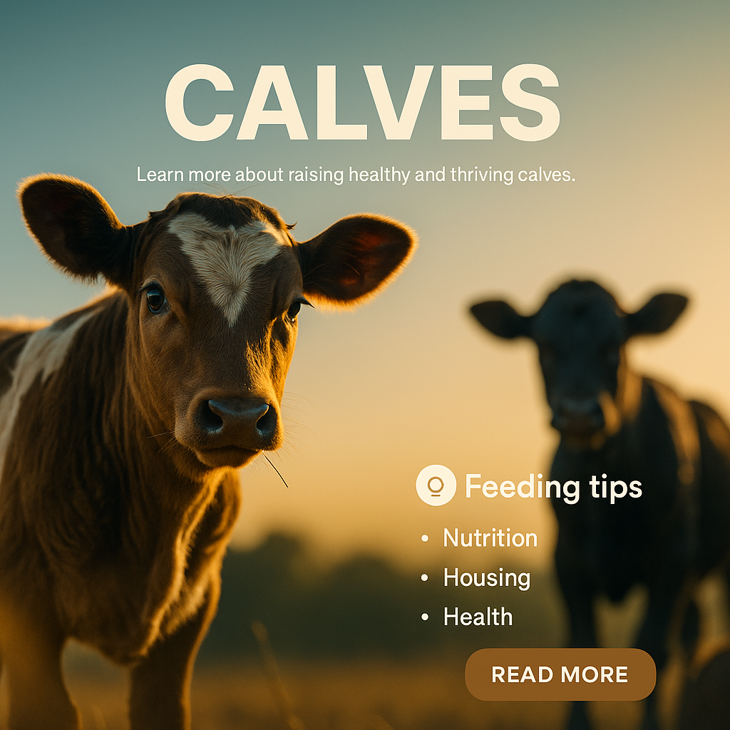 A social media post featuring calves, focusing on tips for their nutrition, housing, and health. The warm tones and engaging imagery appeal to farmers and livestock enthusiasts.