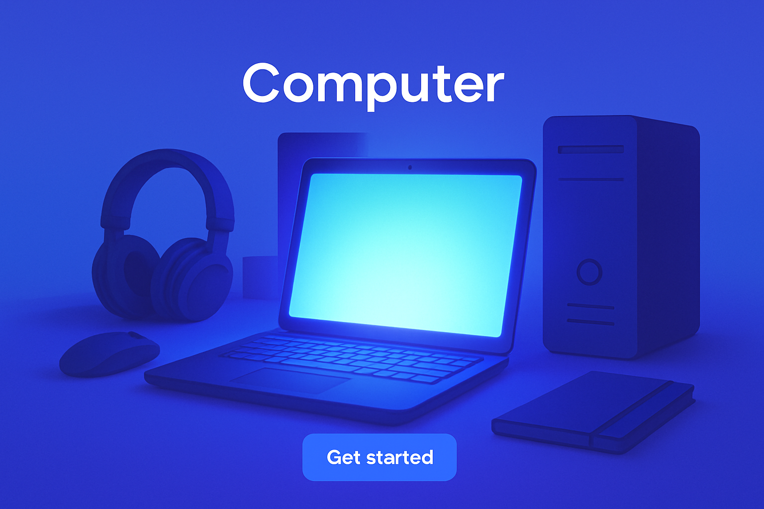 A vibrant composition featuring a glowing laptop, headphones, and a computer tower against a solid blue background. The glowing elements create a captivating atmosphere.