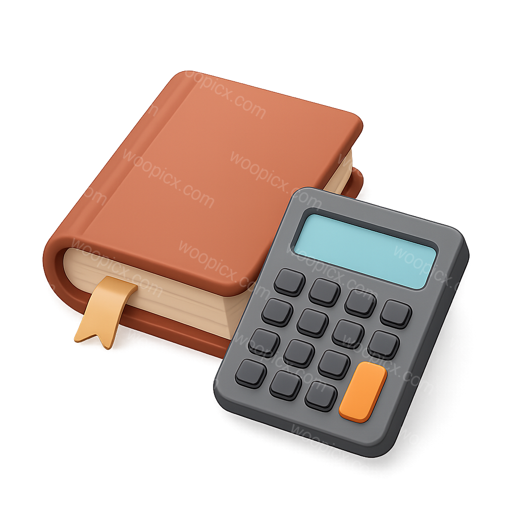 A visually appealing 3D rendering of a brown book with a bookmark beside a sleek calculator, set against a gradient background. The image showcases depth and volume.