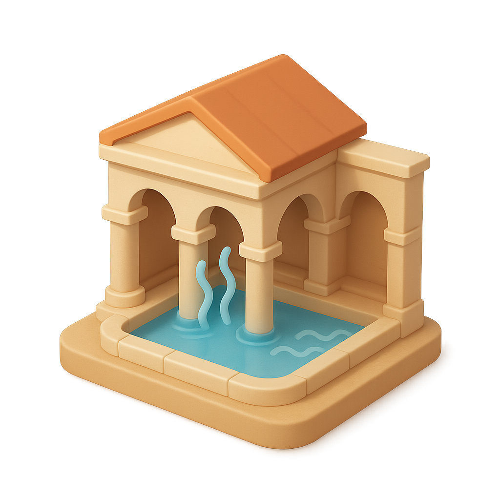 A charming 3D representation of a Roman bath complex featuring elegant arches, a tranquil water pool, and a distinct red roof. The design has a soft, isometric feel.