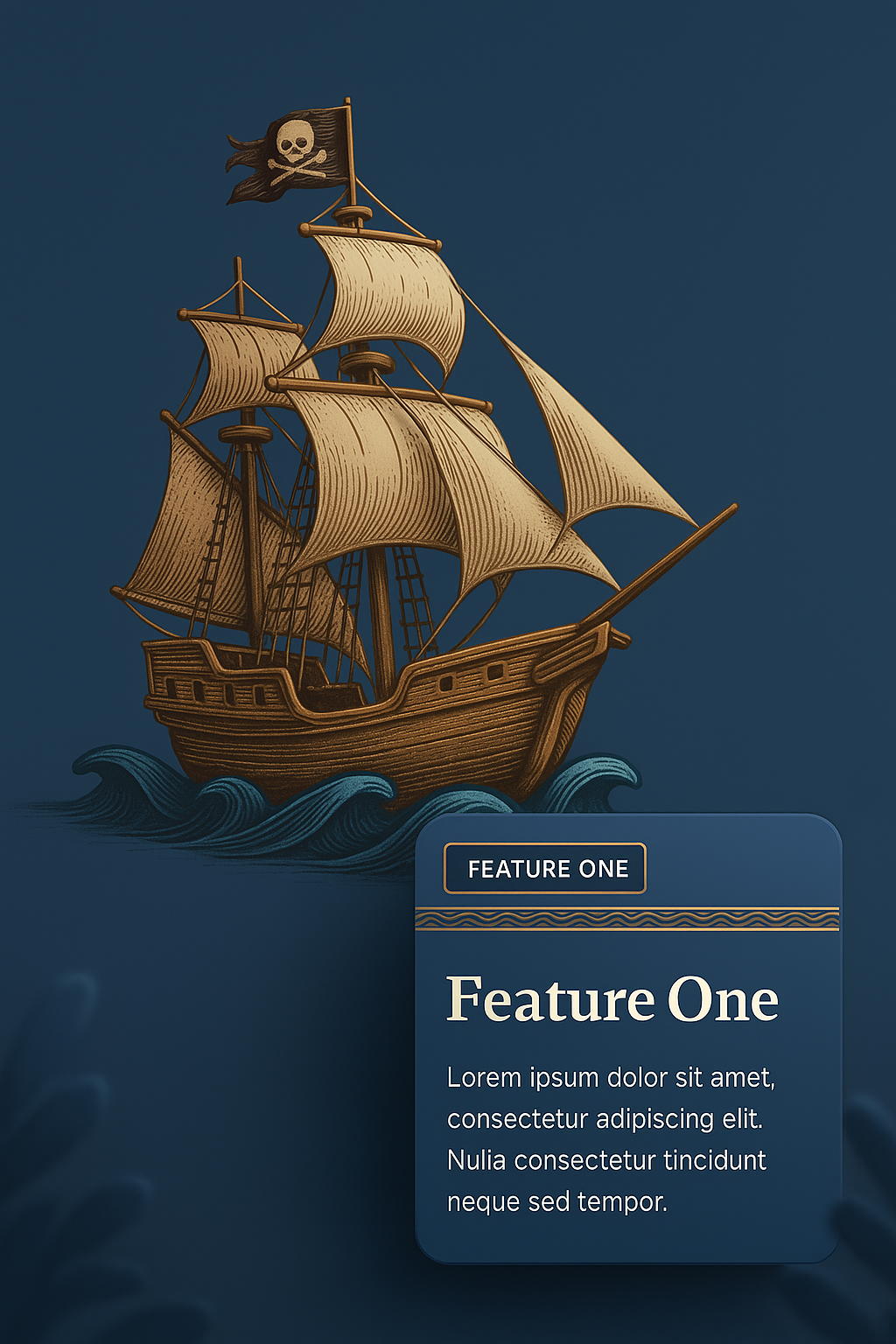 A hand-drawn retro pirate ship sails through stylized waves, accompanied by a feature block describing its elements. The design integrates seamlessly with a smooth gradient background.