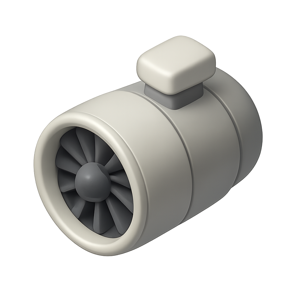 /Collection: /by davooda/Type: PNG/A stylized 3D icon of an aircraft engine viewed from a three-quarter perspective. The design features a smooth, rounded casing and detailed turbine blades, all rendered with a volumetric, isometric feel.