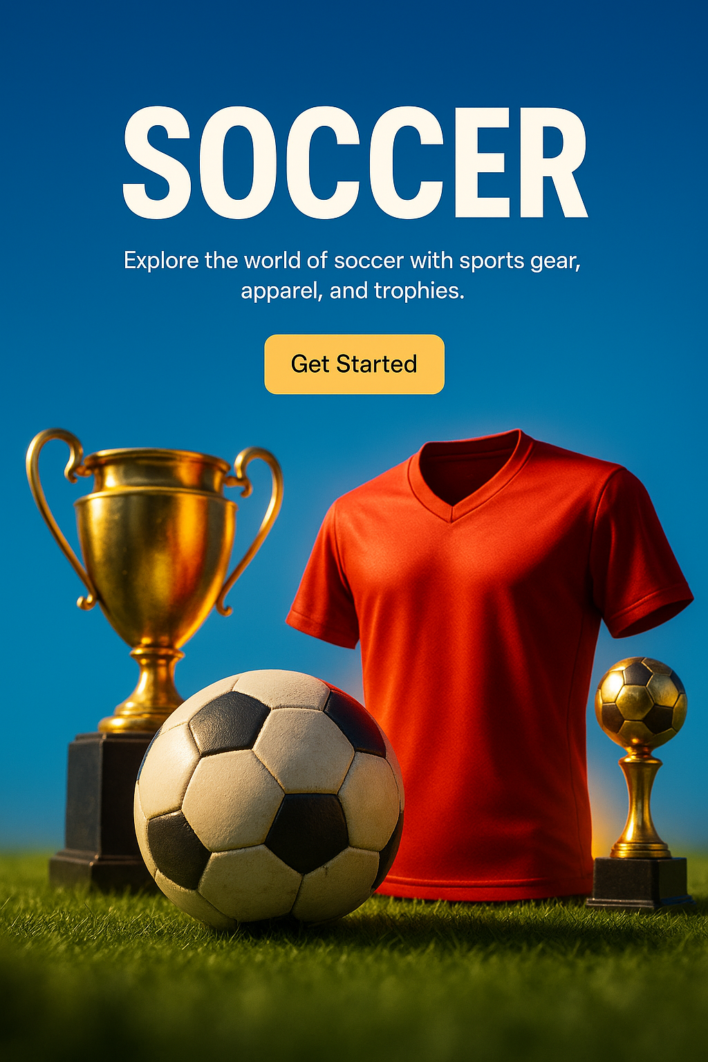 A vibrant promotional image showcasing soccer gear, including a jersey, a ball, and trophies. Ideal for sports apparel and equipment marketing.