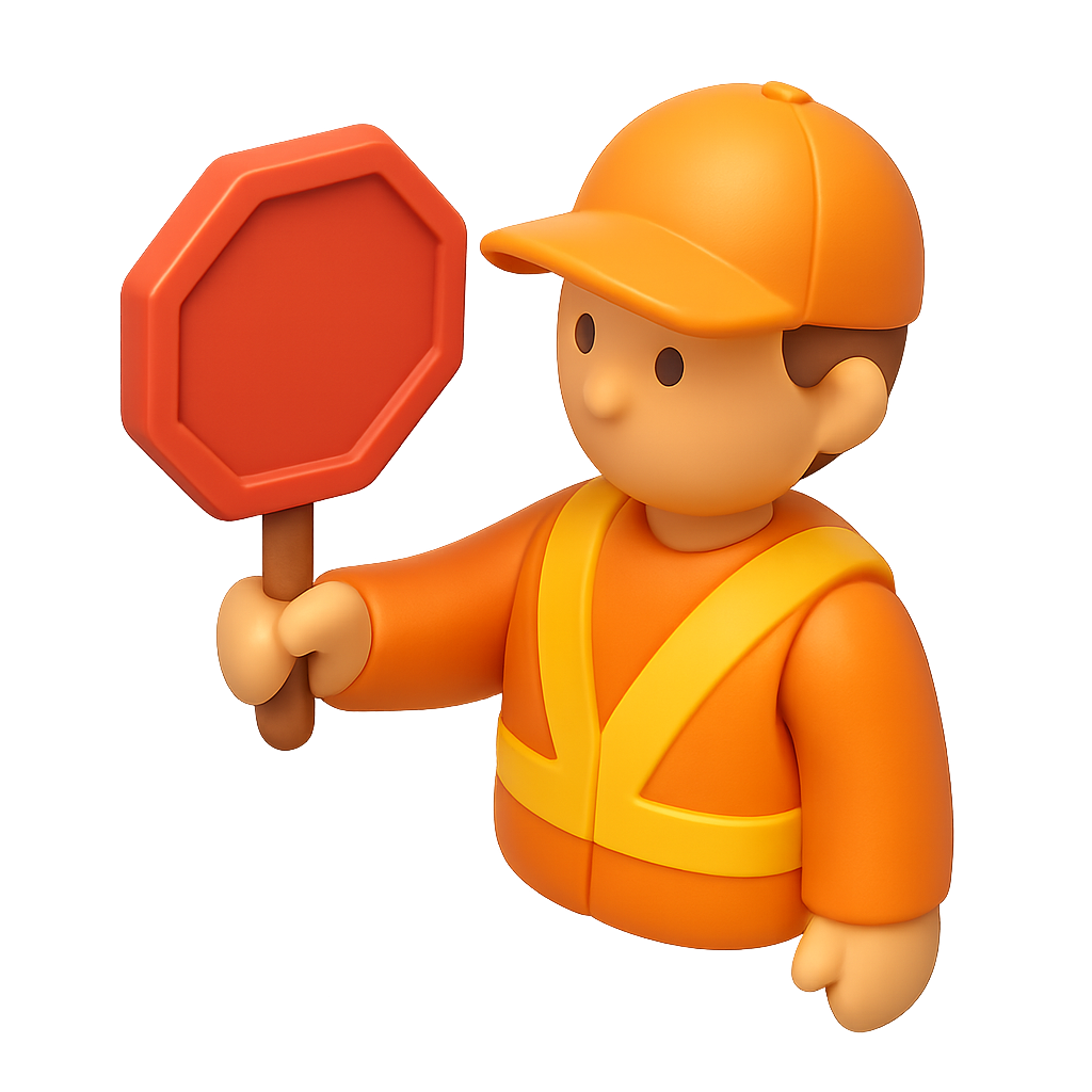 A colorful 3D icon depicting a crossing guard in an orange outfit, holding a stop sign. The figure is designed with a friendly expression and a three-quarter view, emphasizing its volumetric appearance.