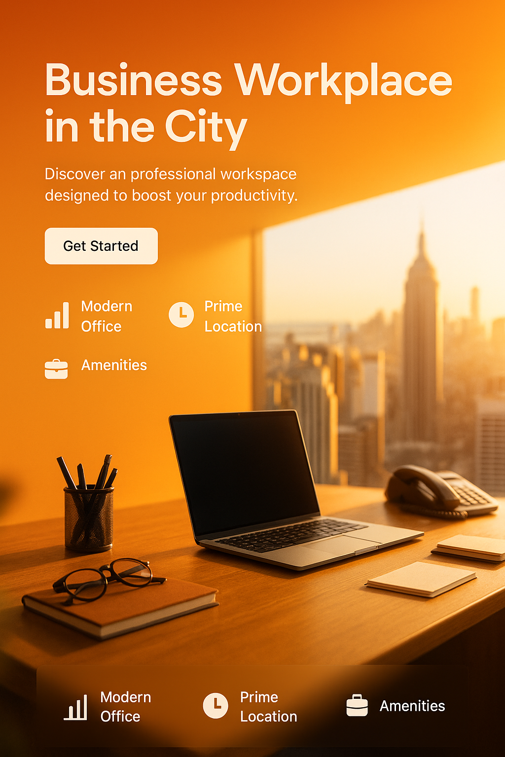 /Collection: /by davooda/Type: PNG/This digital promotional graphic showcases a modern office environment with a city skyline view. Ideal for attracting professionals seeking workspace solutions.