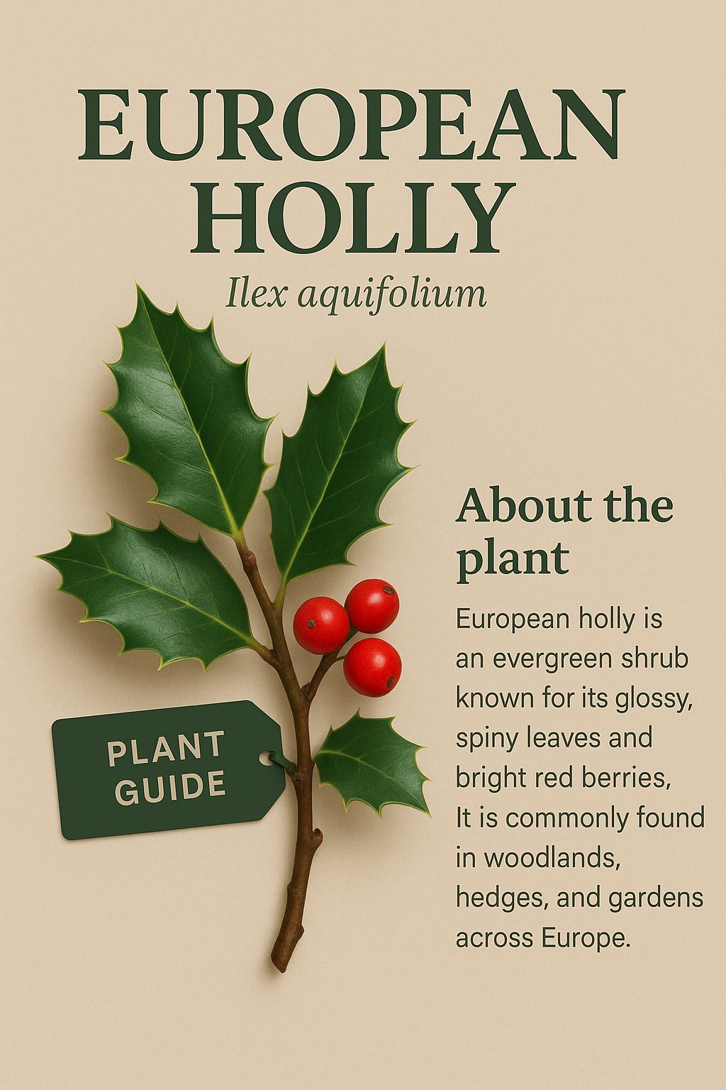 /Collection: /by davooda/Type: PNG/Illustrative plant guide featuring European Holly, showcasing its leaves, berries, and informative design elements. Ideal for botanical enthusiasts and educational purposes.