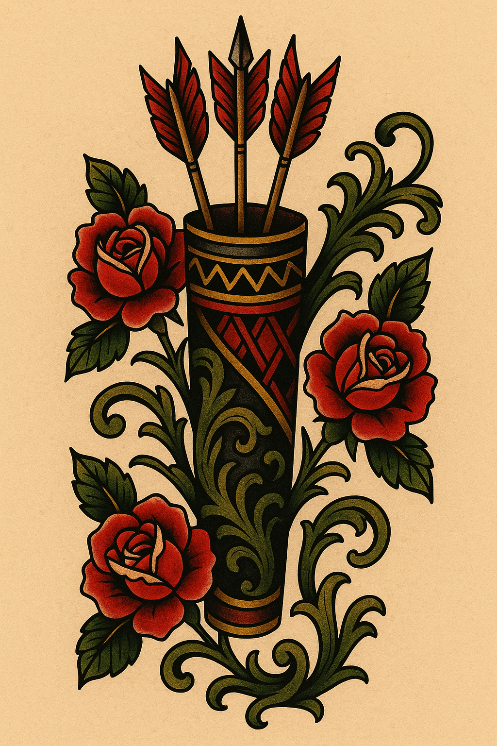 This image features a decorative tattoo design showcasing a quiver filled with arrows surrounded by vibrant red roses and ornate foliage, ideal for tattoo enthusiasts.