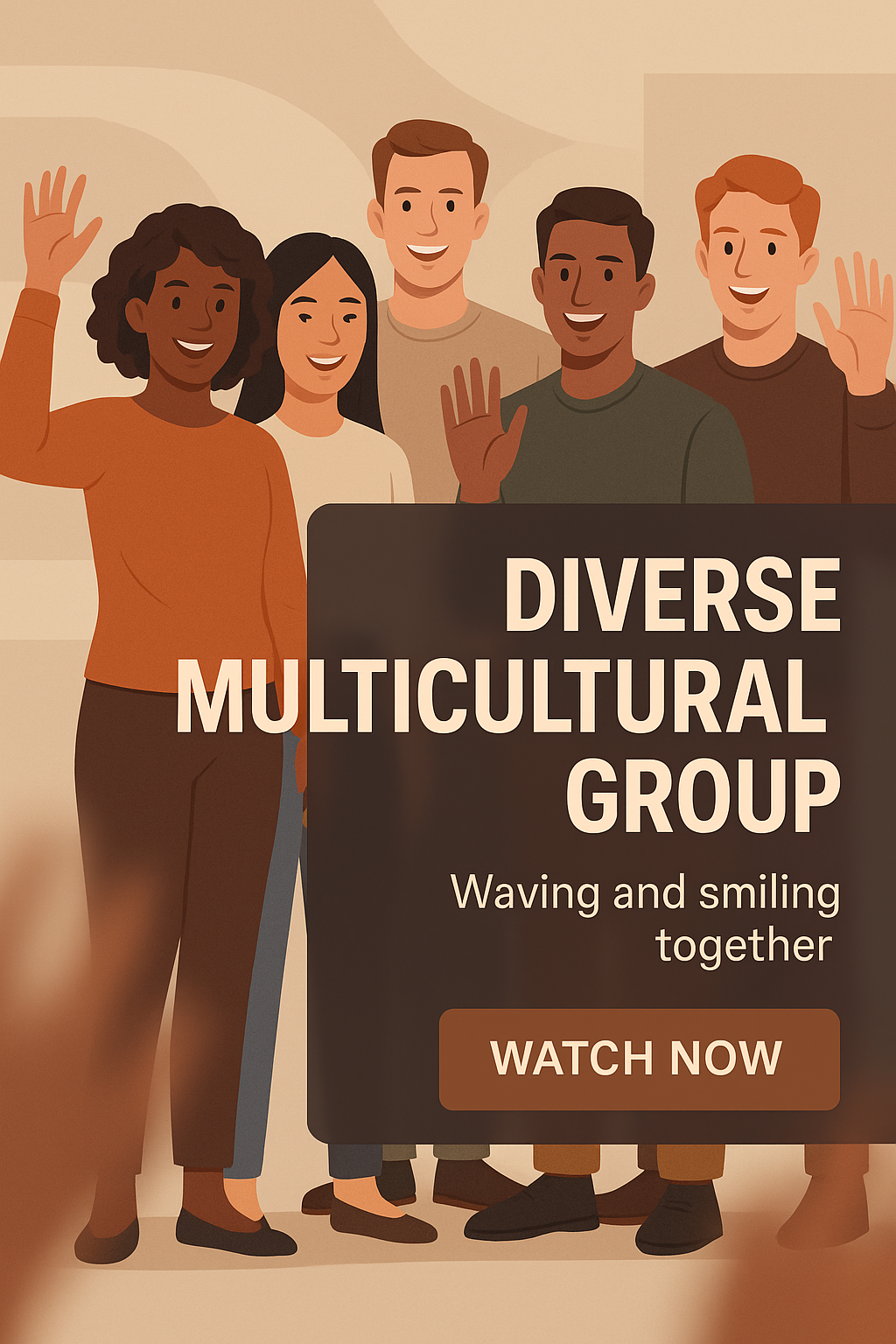/Collection: /by davooda/Type: PNG/Vibrant and inviting illustration of a diverse group of people smiling and waving, ideal for promoting inclusivity and community engagement. Perfect for social media or web use.