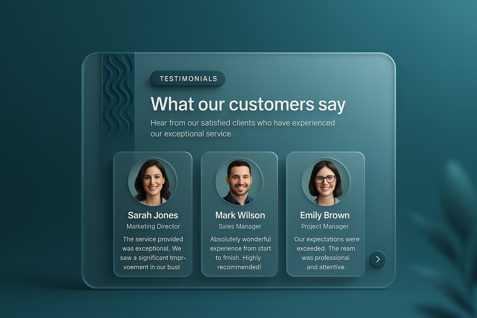 A modern testimonials section featuring three client testimonials with circular photos, names, positions, and comments. The design includes a smooth gradient background and layered composition for depth.