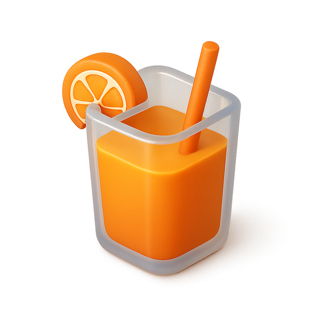 A vibrant 3D icon of a juice glass featuring an orange drink, a straw, and an orange slice garnish. The design showcases a transparent background and a three-quarter isometric view.