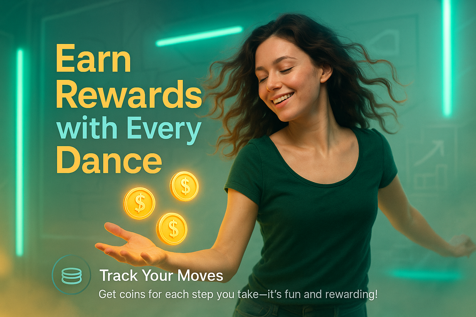 Vibrant promotional image featuring a young woman enjoying dancing while showcasing a rewards program. Ideal for social media marketing targeting fitness and dance enthusiasts.