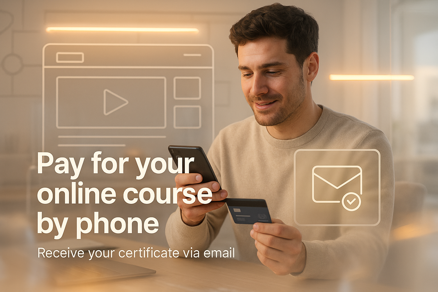 Engaging visual showcasing a user making a payment for an online course via phone, with a modern and clean design appropriate for educational marketing.