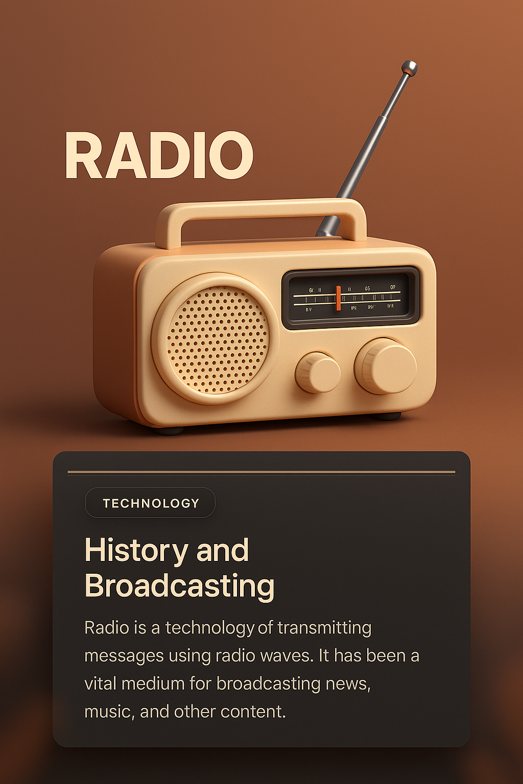 A stylish 3D illustration of a radio with a smooth gradient background, featuring a dark information panel with text about radio technology and broadcasting.