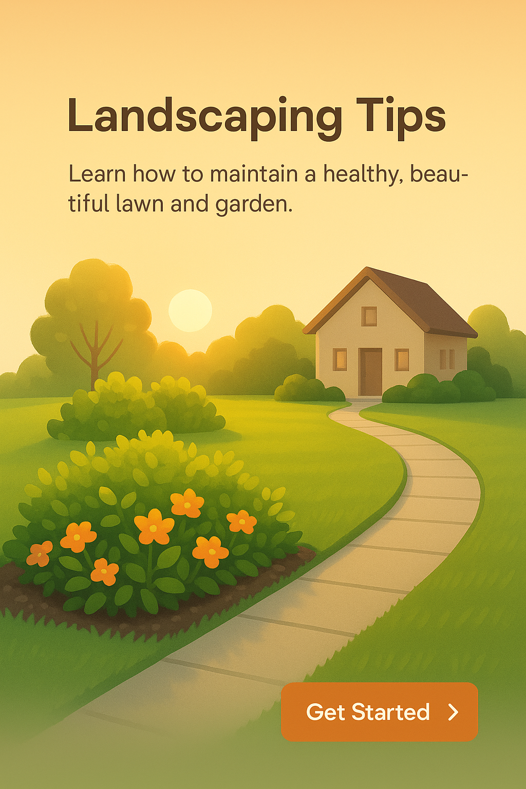 A serene illustration showcasing a manicured lawn and colorful flowerbed with shrubs, leading to a house under a warm sunset glow. The scene emphasizes a peaceful atmosphere.